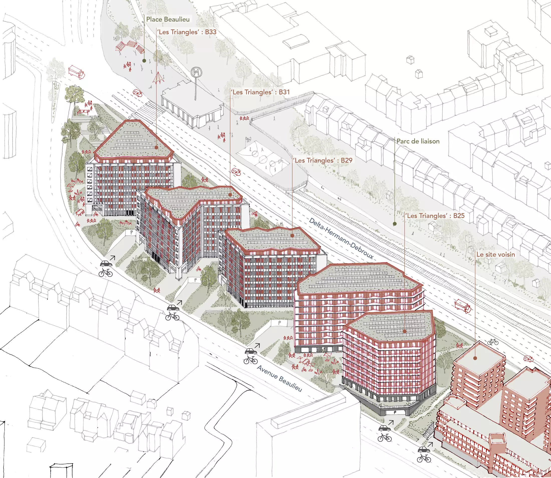 Located at the junction of Auderghem and Watermael, near the Delta site, Beaulieu is undergoing a bold transformation. Originally designed by the Atelier d’Architecture de Genval, the site consists of three emblematic triangular buildings and a fourth structure at Avenue de Beaulieu 25. The project aims to convert these buildings into a dynamic, mixed-use space integrating residential units, offices, retail, childcare, sports facilities, and hospitality.