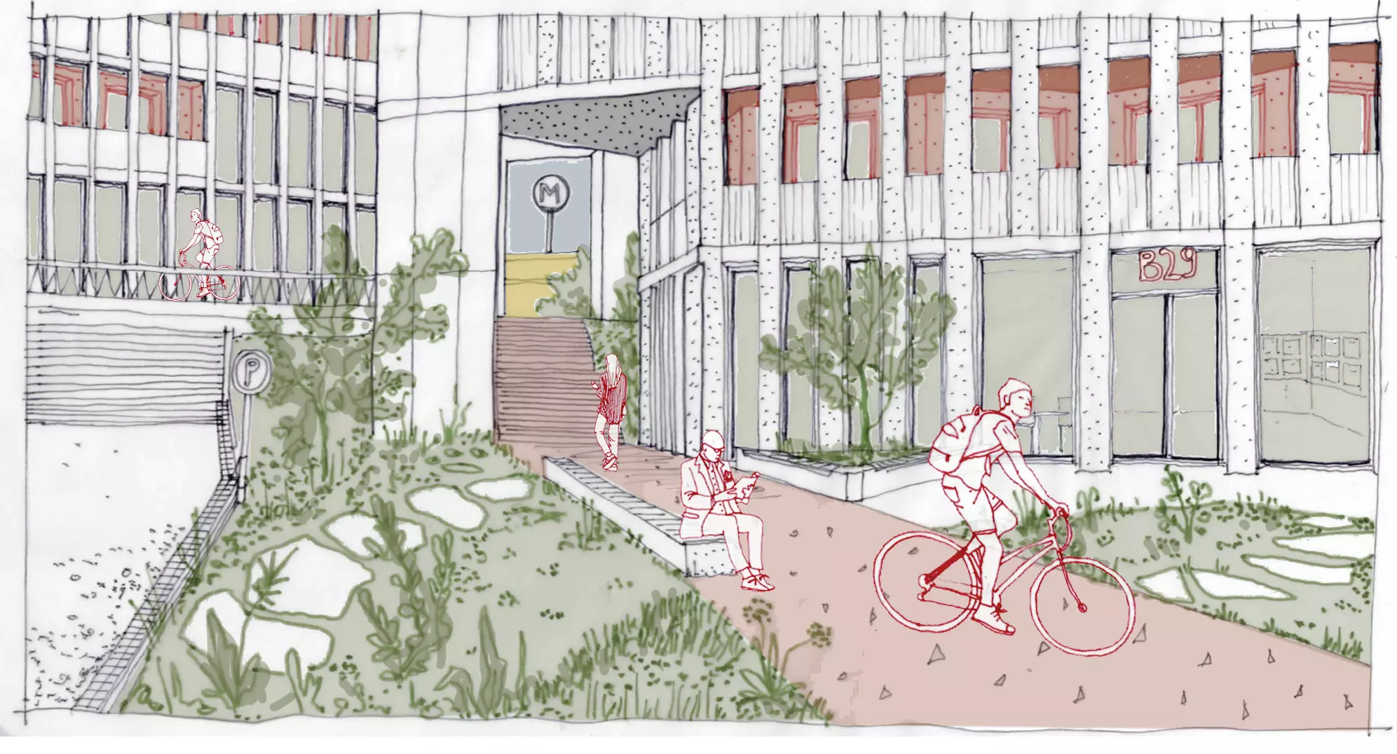 The landscape design is inspired by the site’s geometric history, blending structured architecture with organic green spaces. A landscaped amphitheater, dedicated pedestrian and cycling paths, and terraced gardens create a lively and inviting atmosphere.