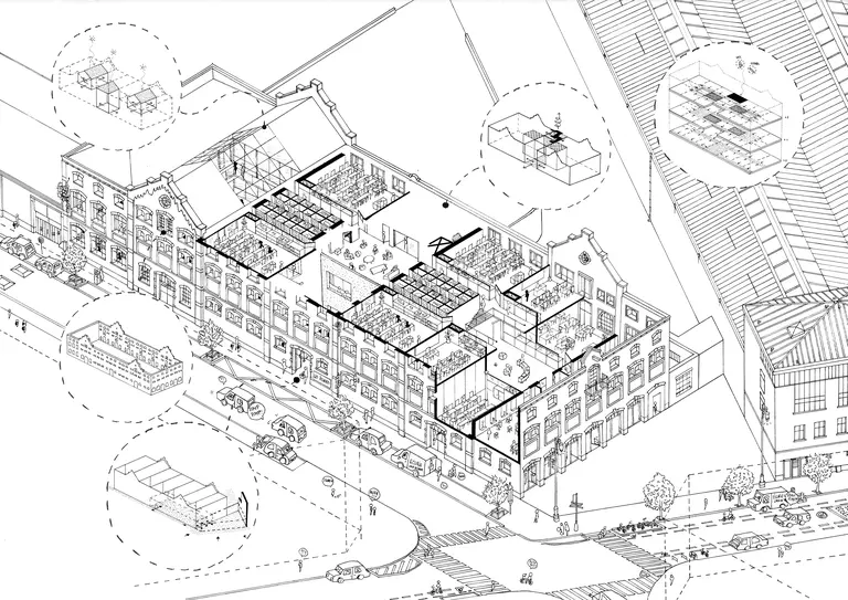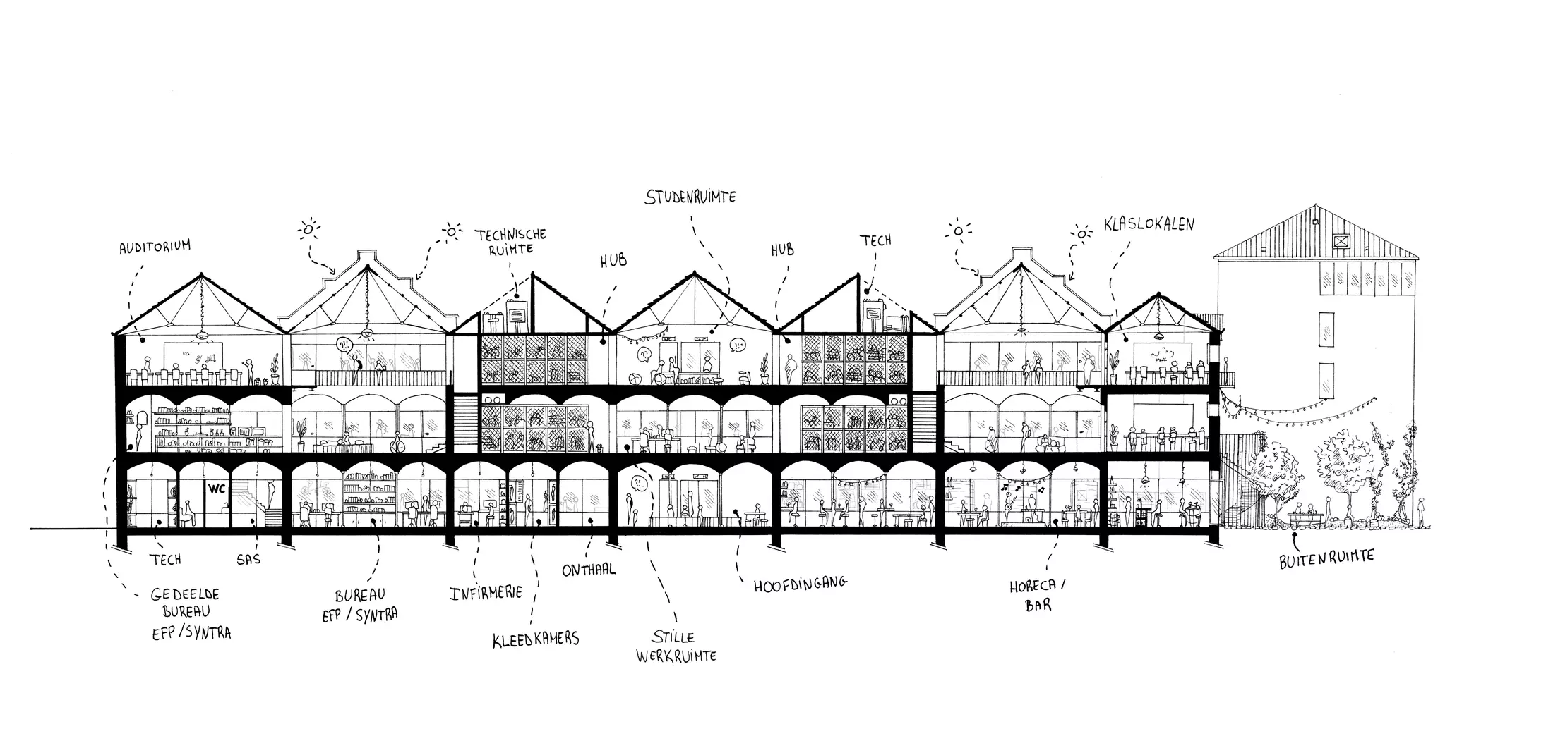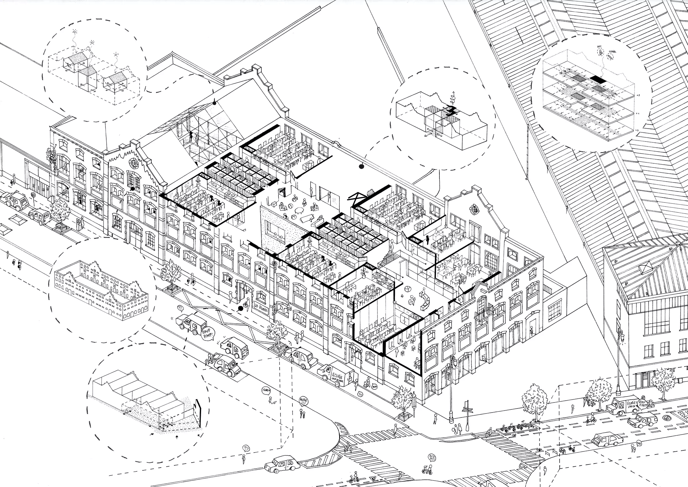 The building is located in a compact urban fabric in a densely populated neighbourhood struggling with a lack of meeting places. The building opened its doors to the public thanks to the arrival of an market and brewery a few years ago, reactivating the building and giving local residents the opportunity to rediscover this mysterious 19th century monolith.