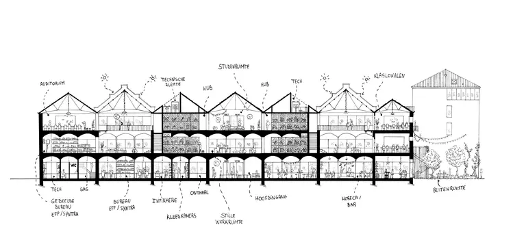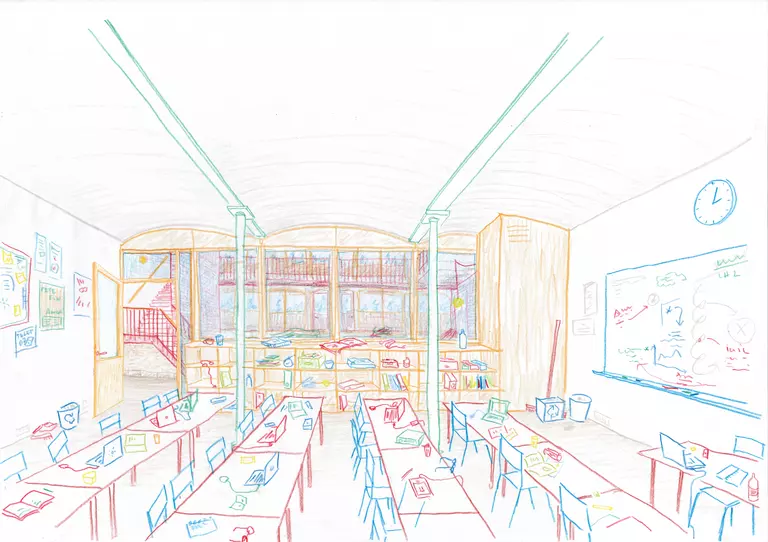 The new project entails the building's renovation and adaptive reuse by incorporating a school function and strengthening its integration with the neighbourhood. Grounded in principles of sustainability and circularity, the project reconsiders spatial organisation and internal flows, focusing on preserving the existing structure and maximising targeted, precise interventions.