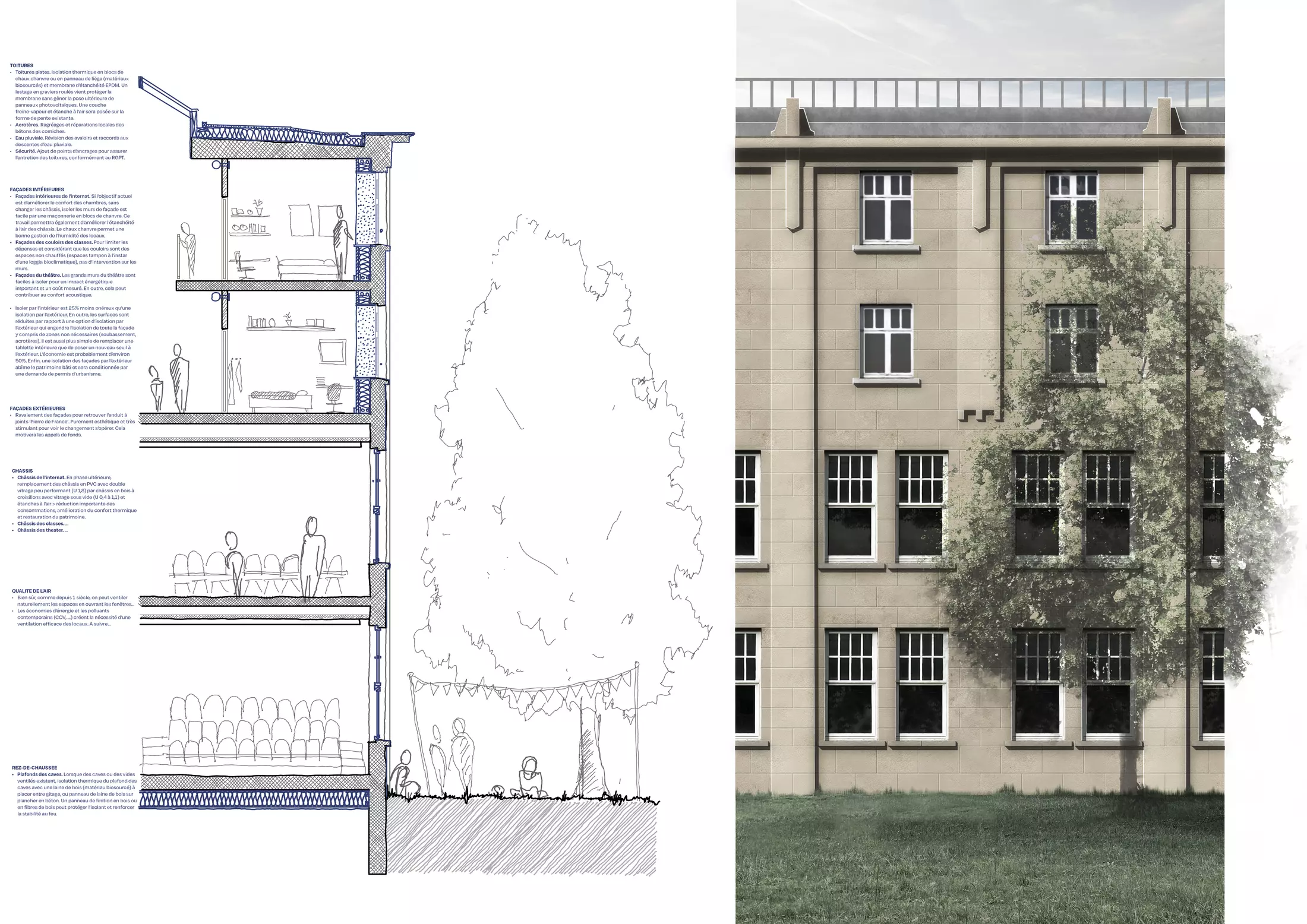 BC is involved in the renovation and insulation of the building envelope of the pavilion and the theatre. This process includes the cleaning and restoration of the existing facades as well as insulating the roof areas. To improve thermal performance, the windows will be replaced with replicas featuring double glazing, ensuring the preservation of the original look.
