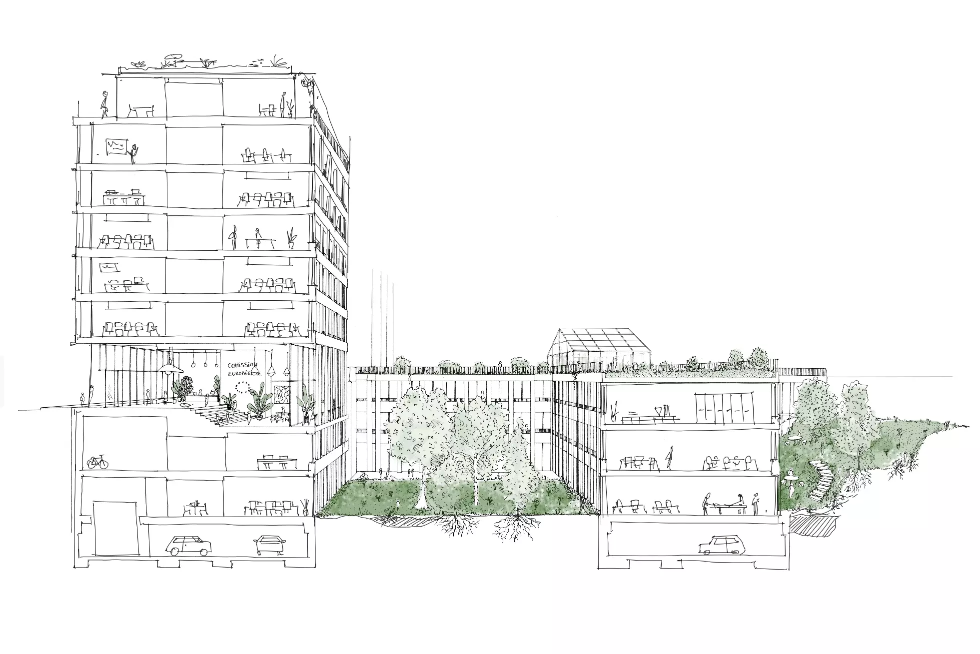 Joseph 54, an office building in the heart of the European Quarter, is due for a technical renovation that also aims to strengthen its public relationship with the surrounding neighbourhood. The renovation methodology prioritises preserving as much of the existing structure as possible. Targeted openings create greater transparency and improve both the internal connections within the building complex and its interaction with the urban environment.