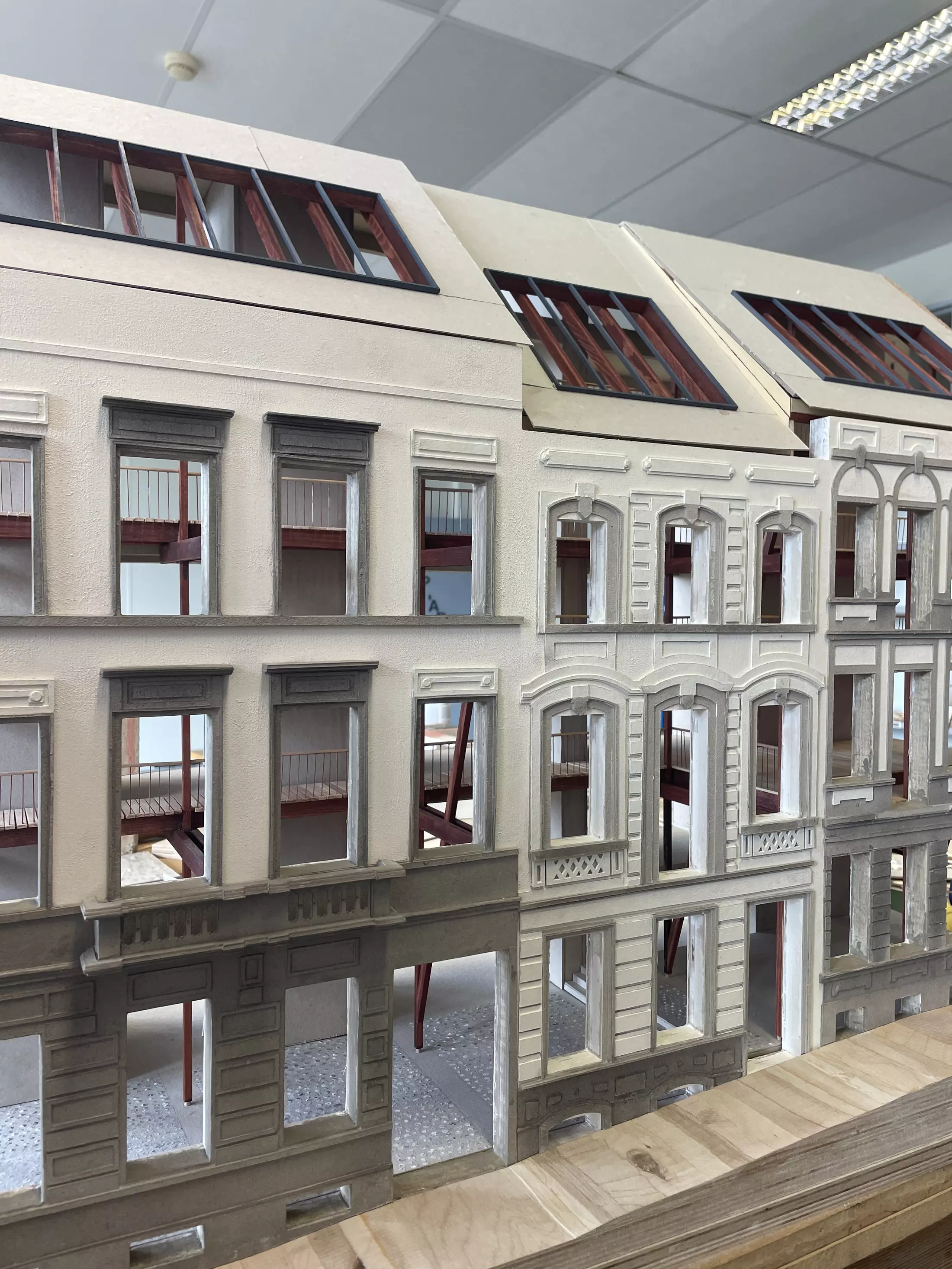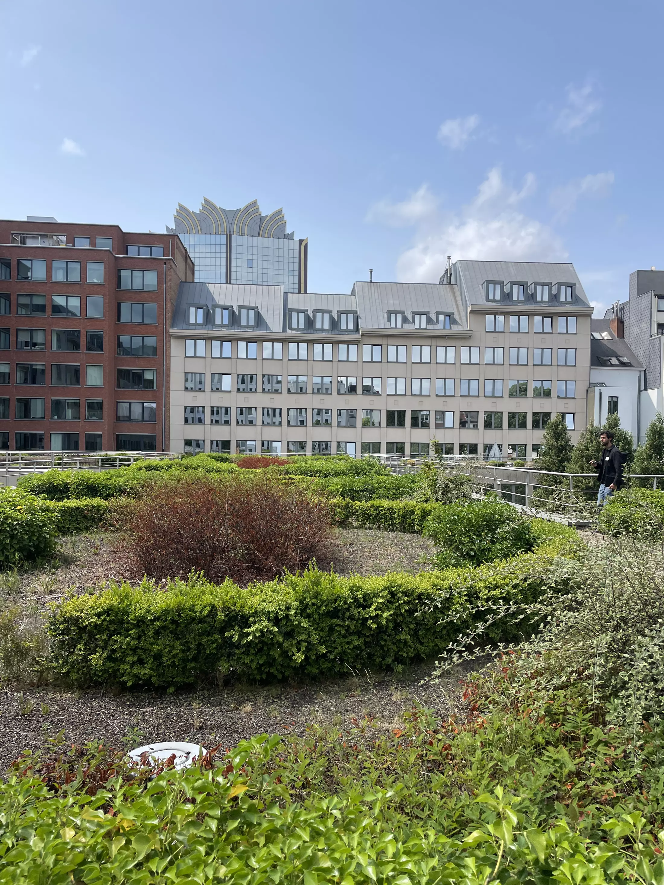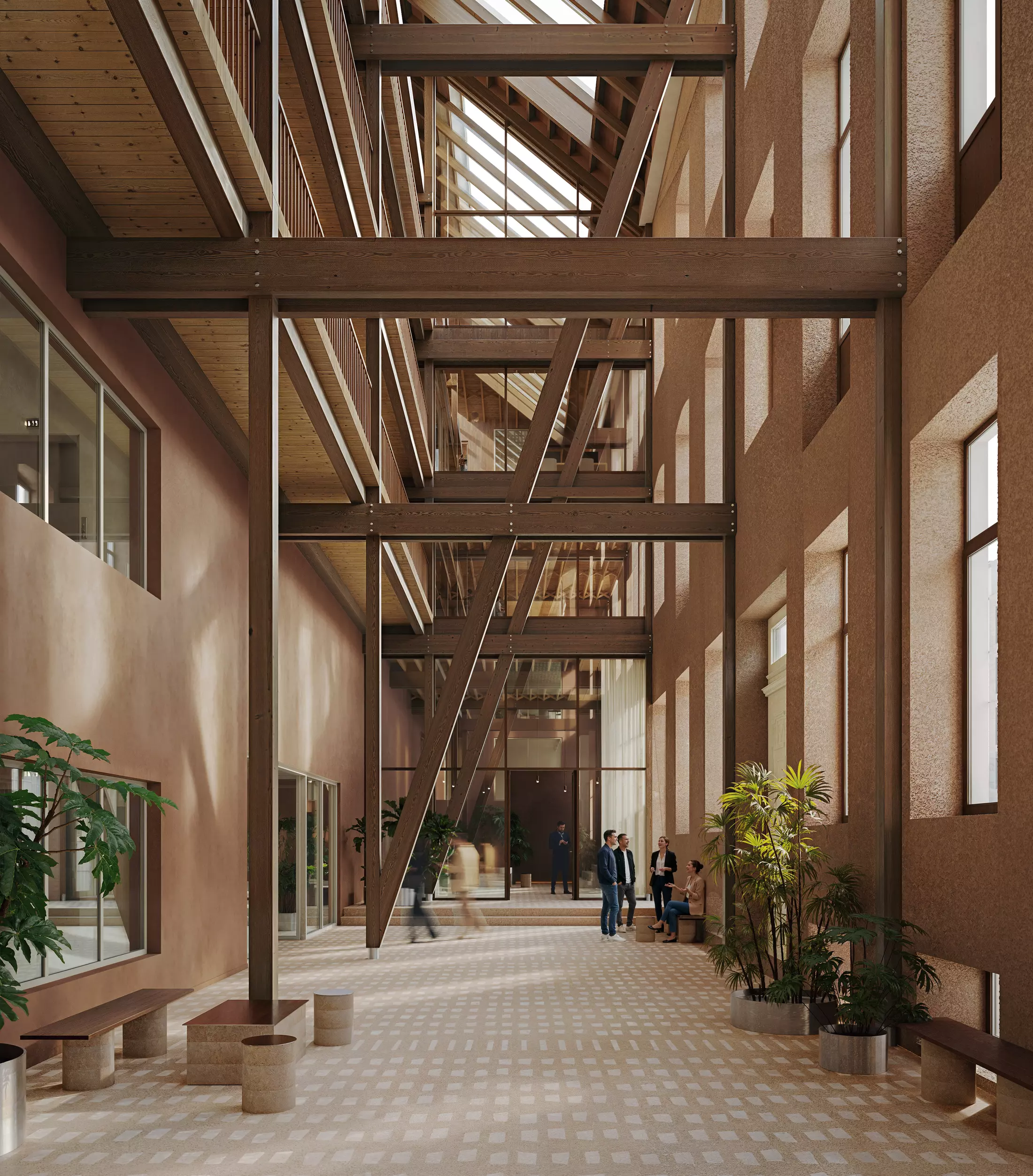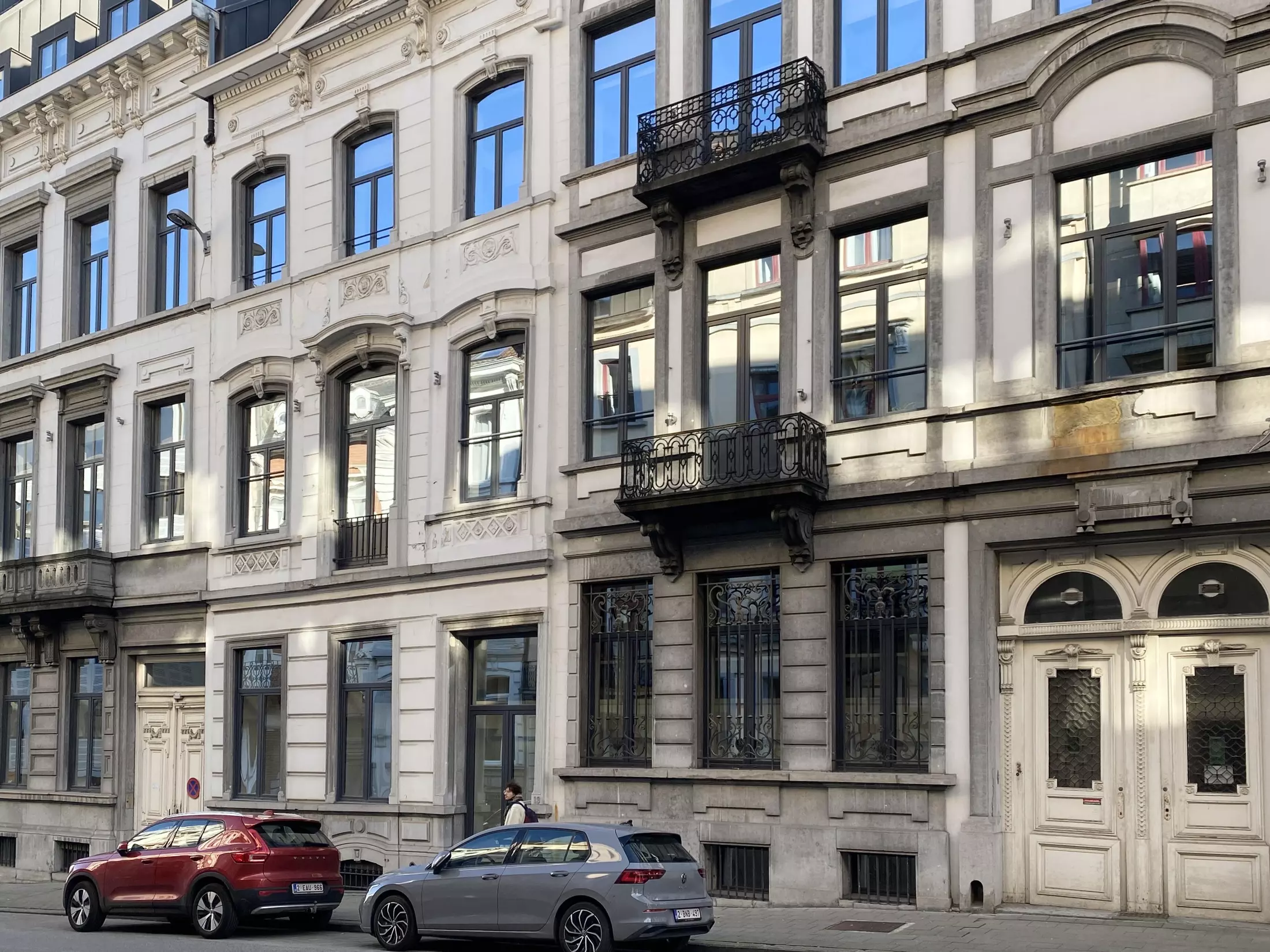 On Rue Joseph II, this results in a double-height lobby overlooking the inner courtyard, street-facing terraces, and space for a public function. The semi-circular top floors are replaced by a lightweight timber extension with terraces. On Rue de Deux Églises, the historic façade is restored and reactivated through an atrium with walkways and natural light.