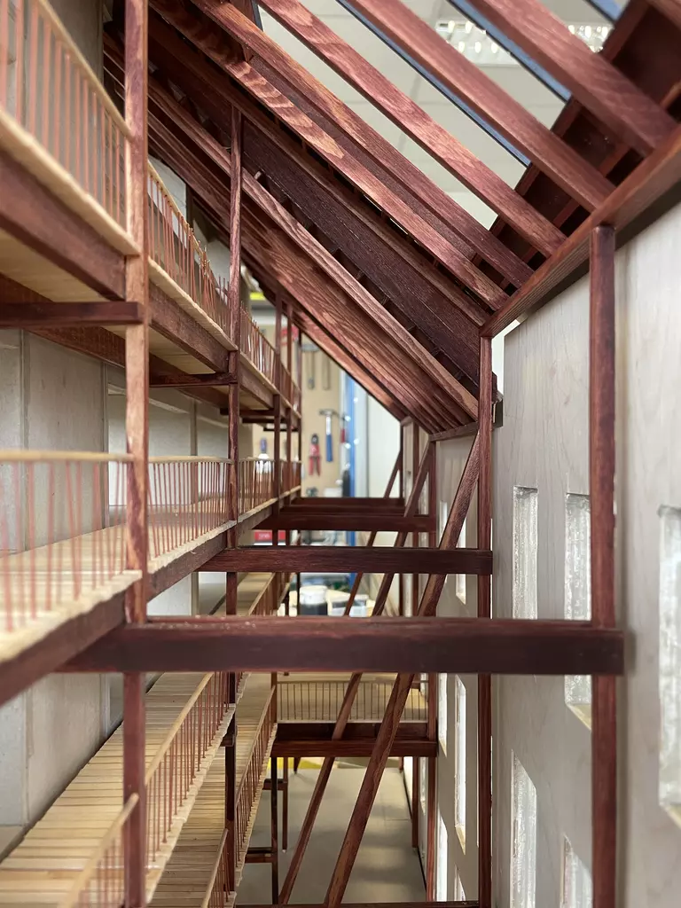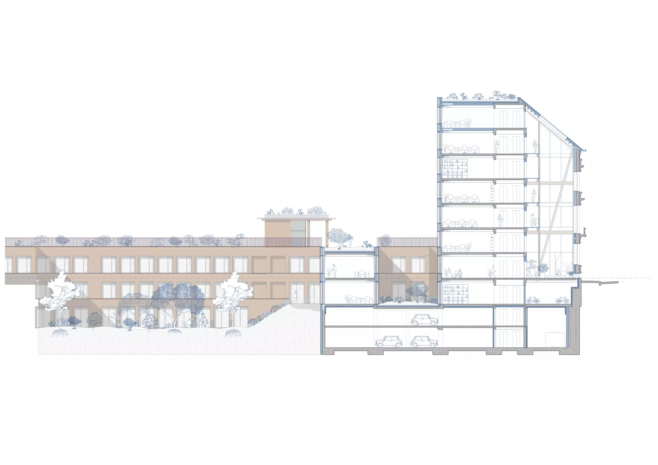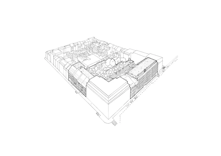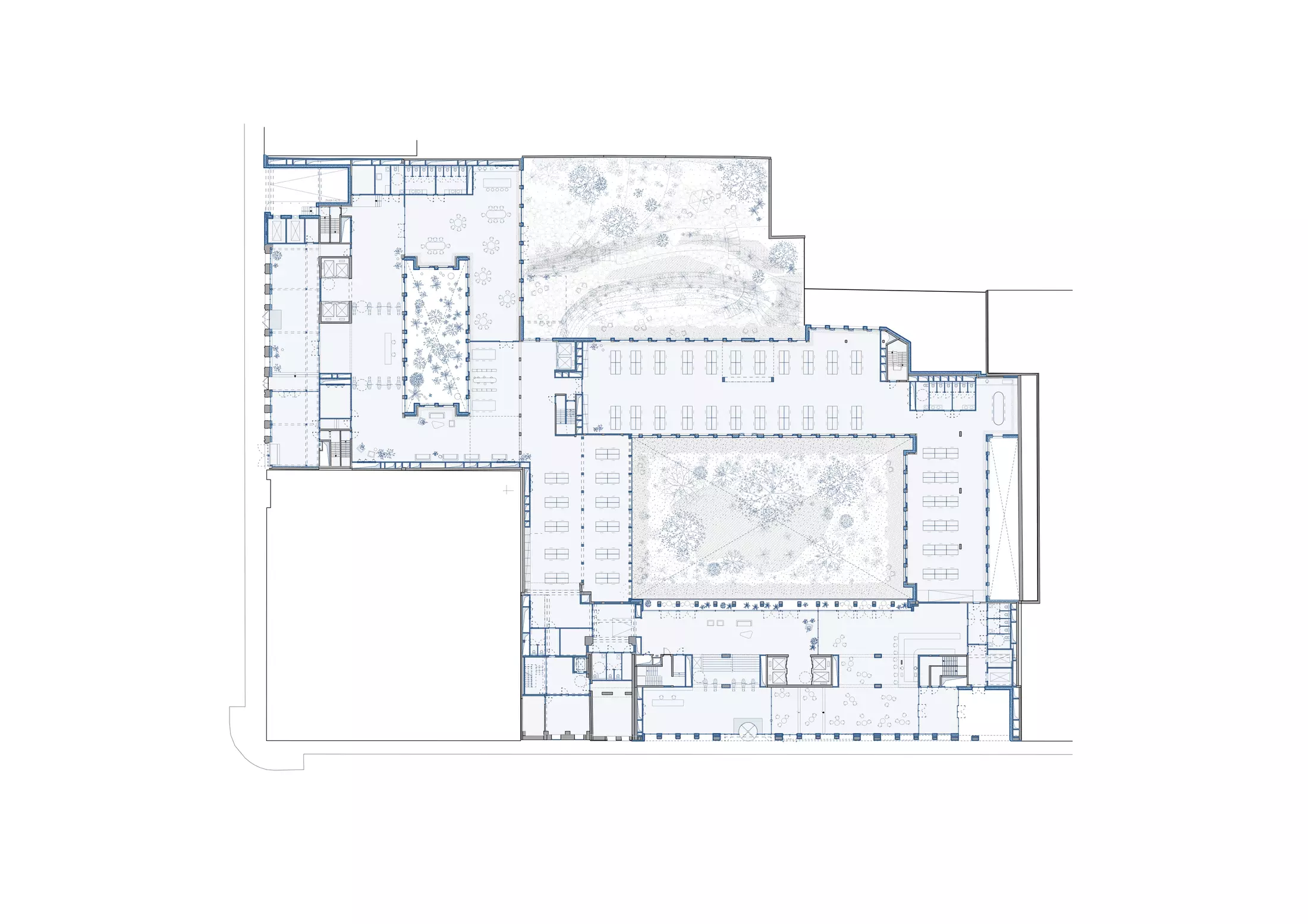 On Rue Joseph II, this results in a double-height lobby overlooking the inner courtyard, street-facing terraces, and space for a public function. The semi-circular top floors are replaced by a lightweight timber extension with terraces. On Rue de Deux Églises, the historic façade is restored and reactivated through an atrium with walkways and natural light.